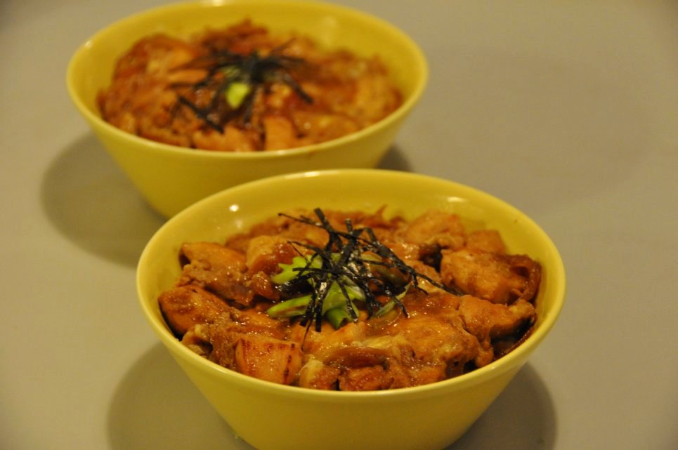 7. Slide half of the chicken & egg mixture on top of a bowl of cooked rice. Garnish with chopped spring onion or seaweed if desired.
