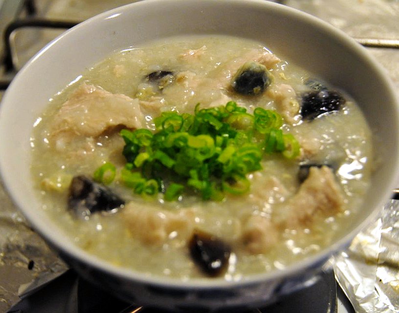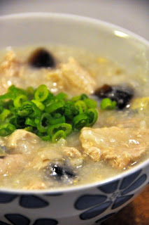 I sliced the pork thinly, lightly minced them to tenderize the meat and bring them to boil in a pot of water. When the stock is ready, season with salt to taste and add in the porridge base. Bring to boil again and let porridge simmer at medium low heat for as long as it take to get silky smooth porridge. In the mean time, cut half a century egg to small cubes (for one person consumption) and chopped some spring onions.