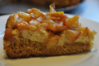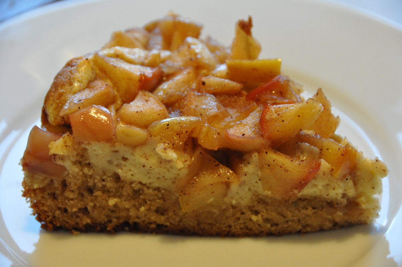 6. Scrape batter into prepared pan and spread it out evenly. Spoon cream cheese mixture over the cake batter and use a butter knife or the back end of a spoon to lightly swirl it in to sort of fuse the two batters together. Gently spoon cooled apples over the batter in an even layer and bake until the cake wobbles ever so slightly in the middle, 45-50 minutes. Transfer pan to wire rack and let cool completely.
