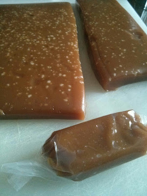 4. With a sharp knife or pizza cutter, cut into squares or rectangles. The caramels can be wrapped in wax paper or cellophane. These caramels can be stored at room temperature (or in the refrigerator), between layers of wax paper, for a couple of weeks.